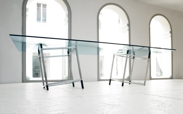 The rigorous, slender and seemingly “unstable” structure is made from black painted cast aluminium tube (20 x 20 mm) (on the inside), and from satin finished stainless steel (on the outside). It supports a tempered, clear glass top only 15 mm thick. The table comes in two versions: the square Détabilisation n. 1 (130 x 130 cm), and the rectangular n. 2 (280 x 120 cm), both 72 cm high.