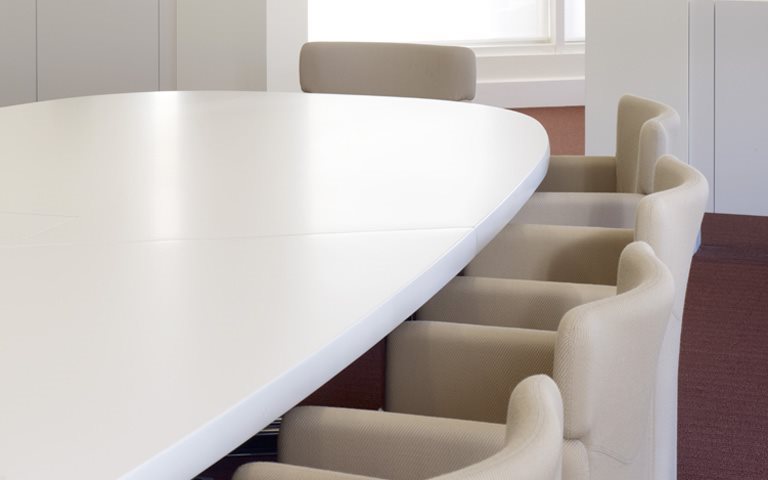 White was the dominating colour on the Graphis tables, complemented by items from the Basic and Cento lines, and on the T335 table, chosen for one of the two boardrooms. A dark oak finish for the Kum tables by Gae Aulenti and black melamine over a chrome base for a special version of the Nomos by Foster + Partners. For the seating in the executive and meeting areas, S148 chairs on castors in hazelnut and the Qualis chairs by Emilio Ambasz.