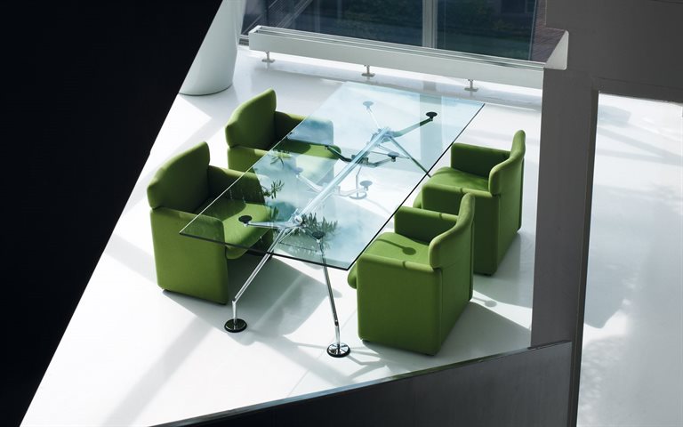 A table for working, reading, talking, discussing, dining, and playing. Altogether, the system solves all functions with a single structural concept, while the cables run in a flexible staple skeleton that allows easy accessibility to electrified outlets.