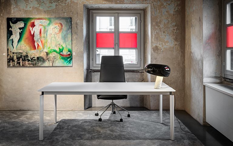 The 45° rotation of the elements ensure quick and easy assembly of the frame, while the tabletop is anchored with magnetic catches. Longitudinal element, transverse element, single or shared leg and tops: these basic components, repeated in a modular manner, allow endless layout solutions.