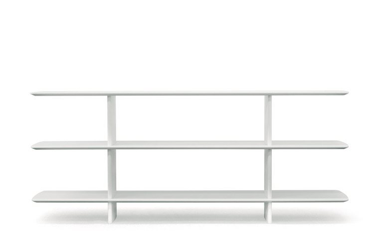La estantería Shift (240 x 45 cm, h 99/139 cm), retoma las formas estilizadas y biseladas de la mesa y está disponible en dos versiones, de 3 y 4 baldas, con estructura de aluminio barnizado opaco blanco.