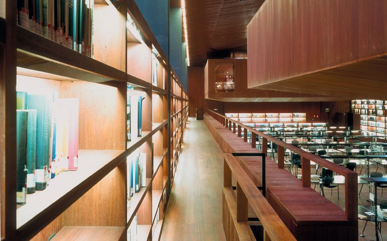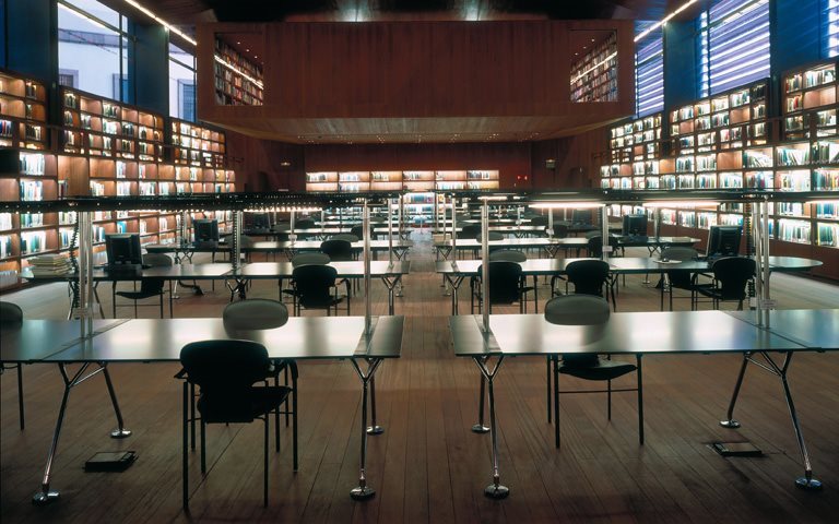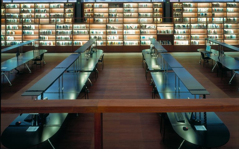 La biblioteca, que se encuentra en el lado sur, tiene una altura de 14 metros y se articula en distintos niveles frente al edificio del ochocientos. Tecno se encargó de equipar la sala de lectura de la biblioteca y las oficinas ejecutivas del Centro de Arte Reina Sofía, con la instalación de más de 100 puestos con mesas del sistema Nomos de florpan negro y bases cromadas.
