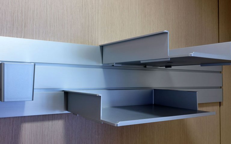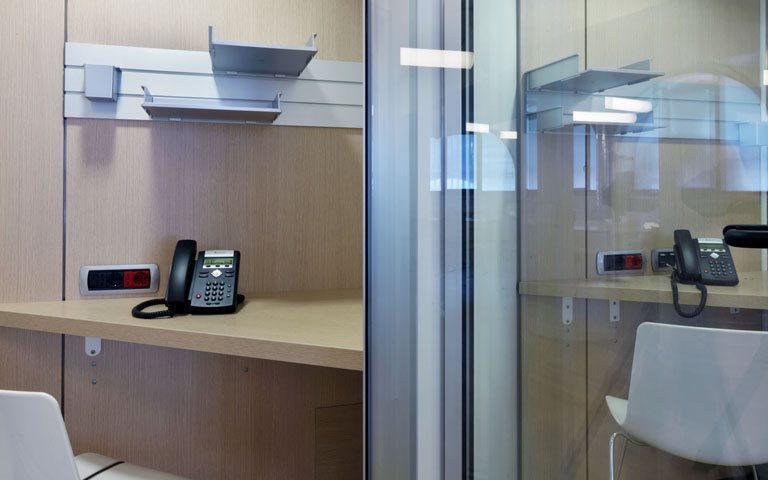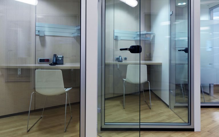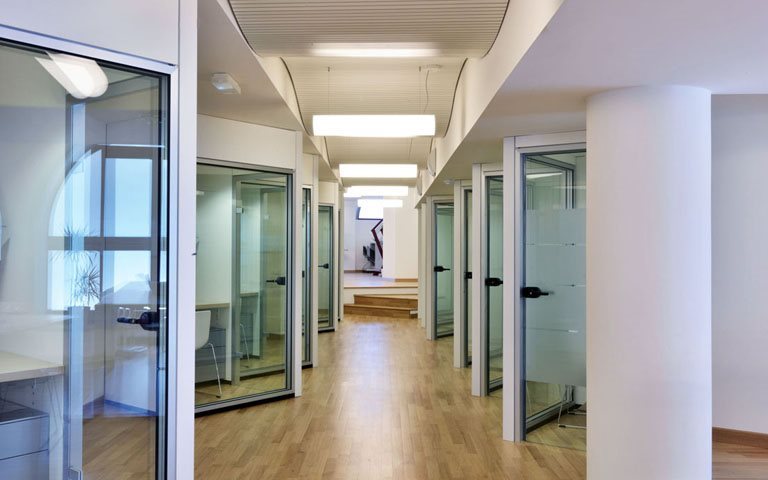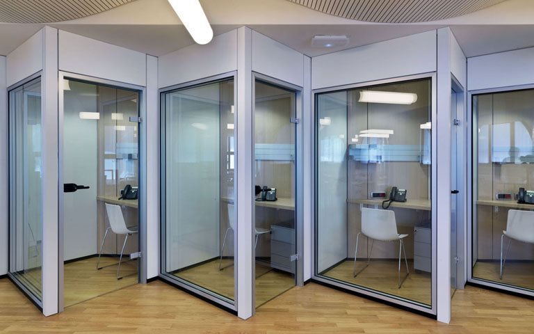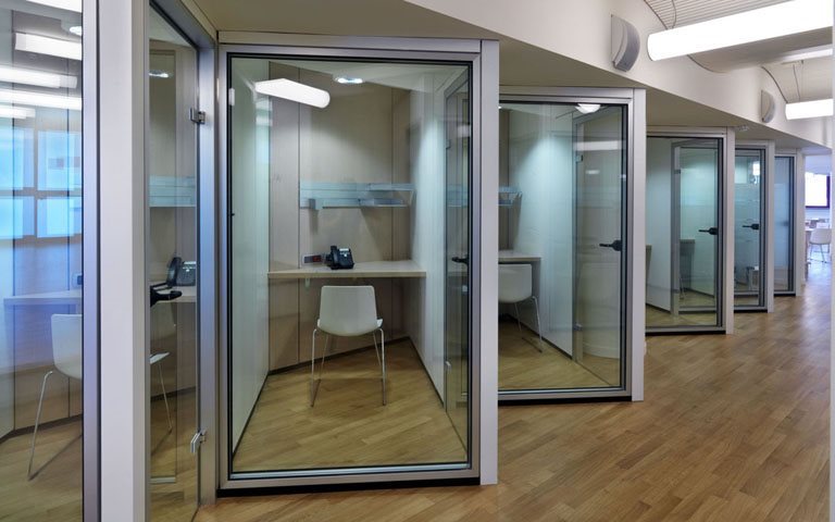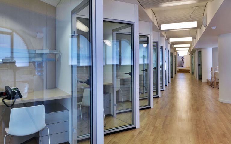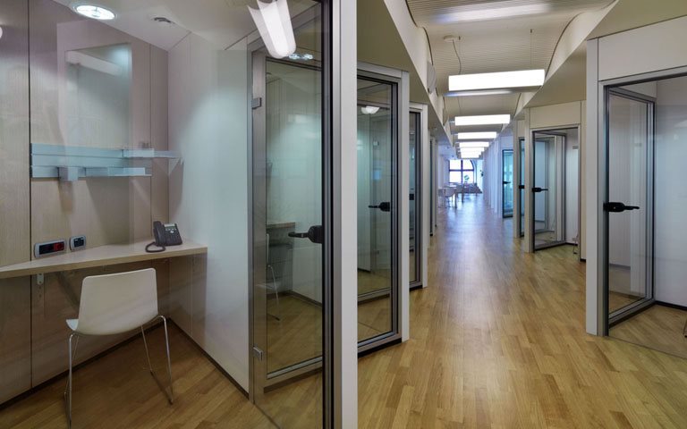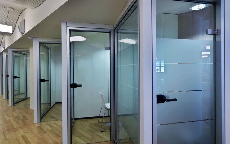 Le pareti sono in parte trasparenti in vetro, e in parte opache con finitura in melamminico grigio chiaro, all’interno le postazioni sono composte da piani tagliati a misura e contenitori modulari a tre cassetti Basic verniciati grigio chiaro.