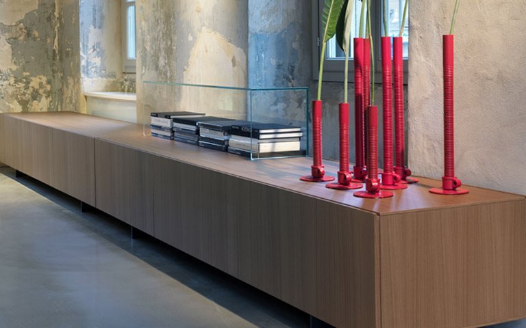 Cento시리지의 캐비닛은 다양한 보관 방법을 제안할 수 있습니다. 모듈은 개방형 전면이나 반 회전문으로 제작할 수 있고, 캐비닛 깊이 또한 표준 깊이나 깊은 서랍으로 제작할 수 있습니다.