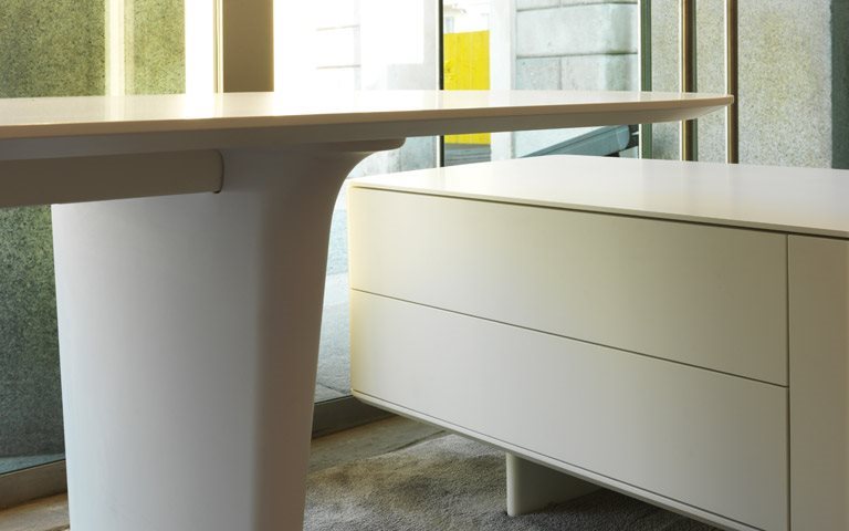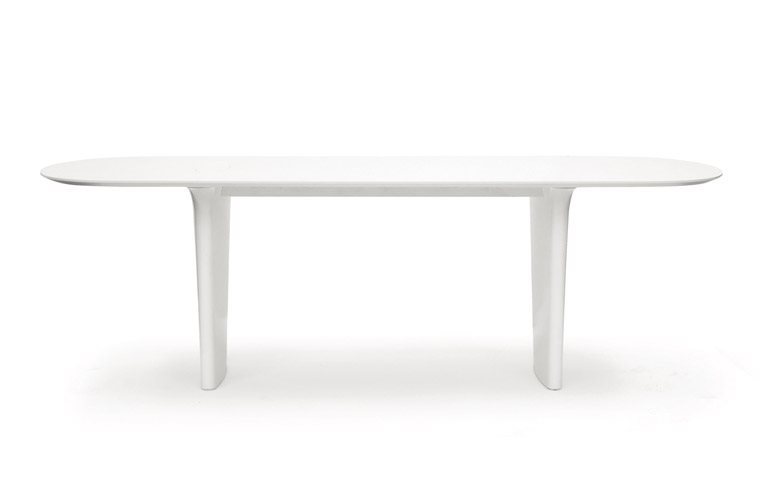 테이블 책상은 (240 x 95 cm, 높이 75 cm) 컬렉션의 특징을 가장 잘 보여주는 요소입니다. 심플하고 타원형태의 모양으로 다양한 기능성까지 포함하여 설계 되었습니다. 전기 케이블은 가느다란 다리 안에 있는 케이블 배관을 통해 정리할 수 있습니다. 테이블의 상판은 무광택/광택 흰색으로 마감처리 된 25mm MDF 패널 혹은 엷은 유광의 오크색으로 아크릴 처리 된 25mm 두께 MDF 패널, 이 두 가지 재질 및 마감재로 선택하여 제작할 수 있습니다. 우아한 둥근 모서리와 밑면조차도 무광 흰색으로 처리되고, 다리 구조물은 무광 흰색으로 마감 처리되었습니다.
