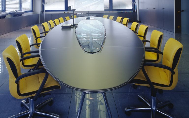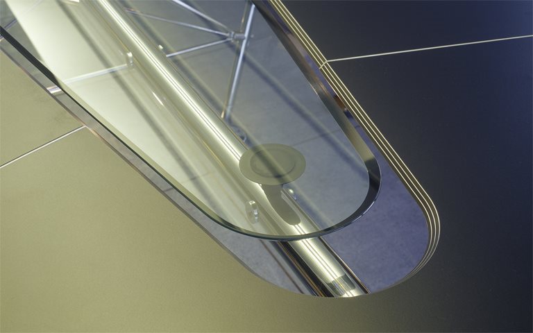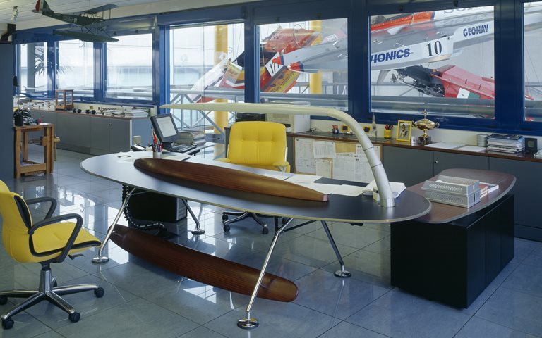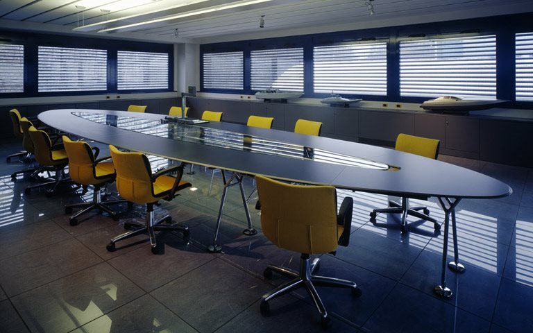 Special editions of the Nomos table were made for different solutions: boomerang-shaped for the head offices, in glass (back-varnished in yellow) with black base for the administration and in a extra-long version (6,5 m) for the meeting room with a glass-core lightened from the floor and the top in AluCompact.