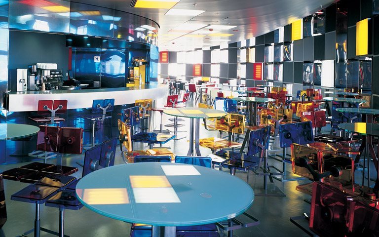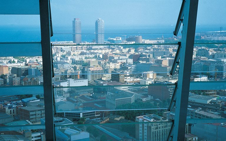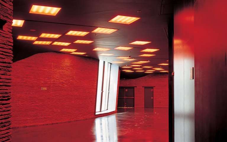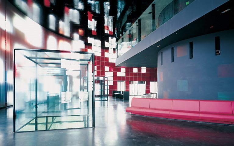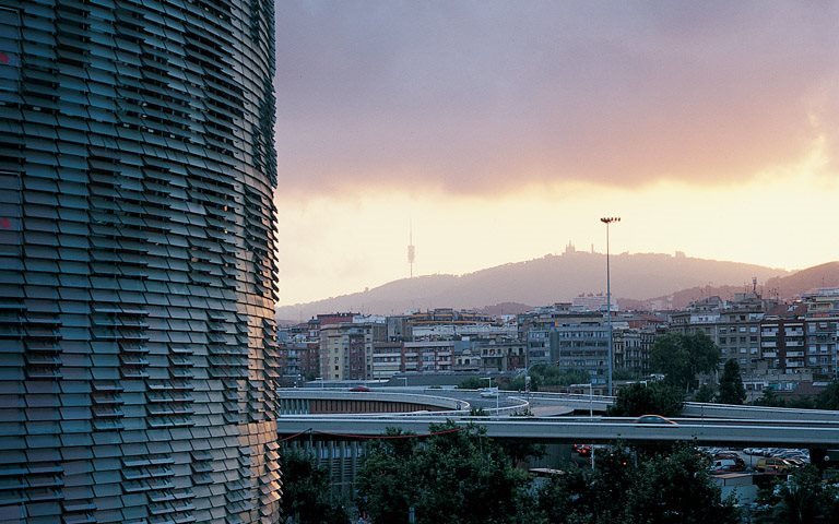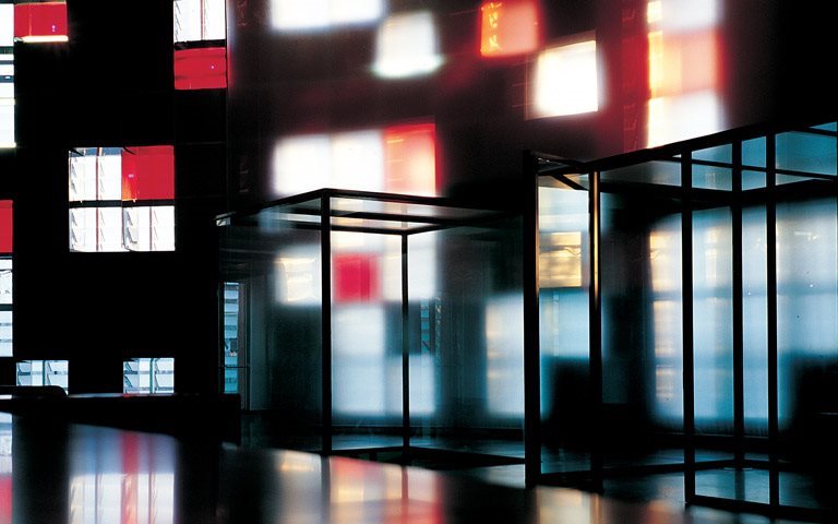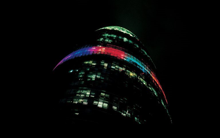 35 floors, 142 metres of height, concrete core, steel and glass frame and 4000 windows placed irregularly over the external façade. Surfaces painted in forty different tones, with varying intensity and luminosity according to the time of the day and seasons. The themes of light and colour appear again in the lifts that gradually change with the movement. The plan of the building is not circular but consists of four curves with different rays.
