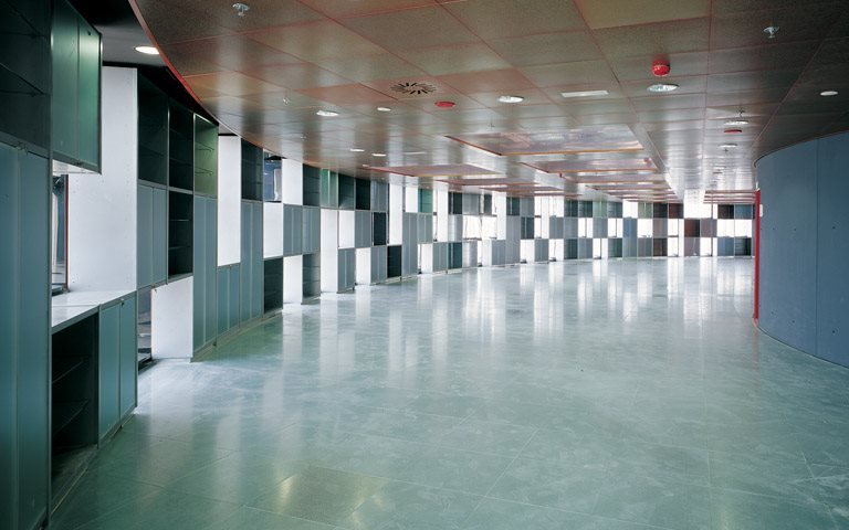 Tecno, with a big experience in tailor-made offers, overcame the planning difficulties by creating cabinets with a high degree of engineering and industrial components. Important in enhancing the aesthetic value of the cabinets is the use of extremely precious materials: steel plate abutments (metal-silver painted), wooden structural surfaces (metal-silver painted), and internal shelves in tempered transparent glass. Doors are in acid-treated tempered glass with frames in sanded polycarbonate. For Torre Agbar Tecno used and interpretated the design language, considering fundamental the attention to products and details.